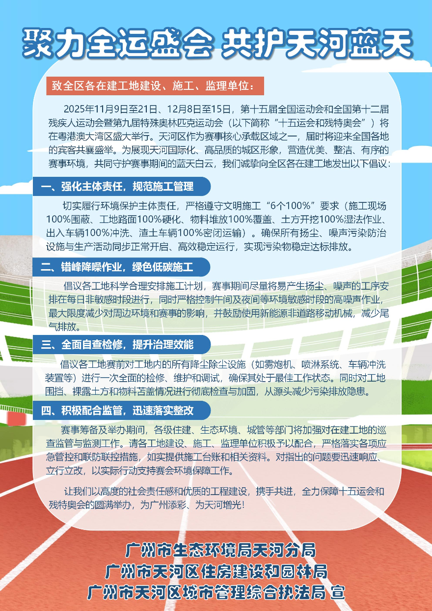 近日,為全力保障十五運會和殘特奧會期間的環境空氣質量,廣州市生態環境局天河分局、天河區住房建設和園林局(區交通運輸局)、天河區城市管理和綜合執法局針對與空氣質量息息相關的五類重點對象,共同發出《聚力全運盛會 共護天河藍天》系列倡議書,變“監管”為“共治”,化“要求”為“邀請”。