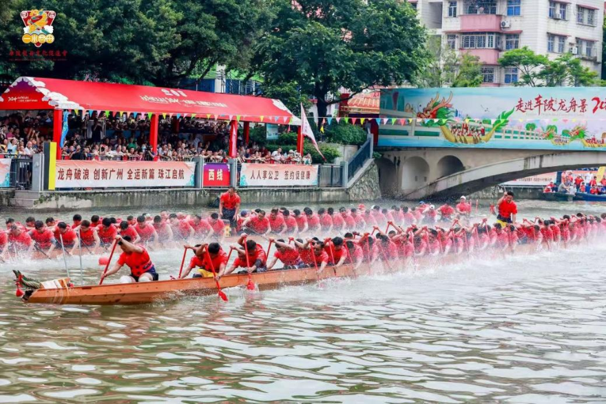 車陂涌長達600多米的直河道,可供4艘龍舟并排游弋,為車陂村扒龍舟的繁榮帶來先天優勢。距今約150多年前,車陂就有了一只“龍船乸”,而后1868年由蘇氏后裔建造了龍船公“東坡號”,使車陂龍舟文化得以傳承發展。依托龍舟文化,車陂涌打造了“四橋六景”景觀帶。每年端午,都會舉辦傳統龍舟賽事,吸引數萬市民游客共賞“百舸爭流”的盛景,成為嶺南水鄉文化的重要符號,展示著獨特的生態文化魅力。