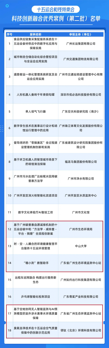 近日,十五運會和殘特奧會科技創新融合優秀案例和示范案例(第二批)名單正式公布,共包含8個示范案例和27個優秀案例,覆蓋城市服務、賽事保障、場館運營和科技助殘四大場景,既服務重大賽事又助力城市高質量發展。其中,由廣州市生態環境局推薦的6個案例悉數入選(含1個示范案例)。