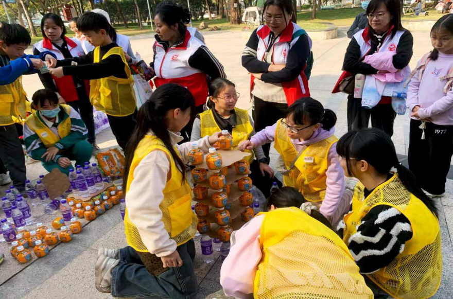 本次活動創新采用“飲料瓶搭建水塔”的互動形式,將環保理念與團隊協作、動手實踐深度融合。美麗廣州親子志愿服務隊分組協作,以飲料瓶為“建材”,共同設計并搭建穩固的“水塔”。在搭建過程中,各組志愿者展現出良好的協作精神和環保智慧,有的通過飲用部分飲料減輕瓶重以提升結構穩定性,有的利用空瓶進行創意裝飾,生動體現了資源循環利用與低碳創意的有機結合。
