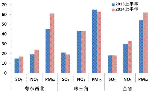 2014年上半年,全省二氧化硫平均濃度為18微克/立方米,與上年同期持平,達到國家年度二級標準;二氧化氮平均濃度為33微克/立方米,較上年同期上升10.0%,達到國家年度二級標準;可吸入顆粒物平均濃度為62微克/立方米,較上年同期上升14.8%,達到國家年度二級標準;細顆粒物平均濃度為44微克/立方米,超過國家年度二級標準;臭氧日最大8小時均值濃度為131微克/立方米,達到國家年度二級標準;一氧化碳濃度為1.8毫克/立方米,達到國家年度二級標準。