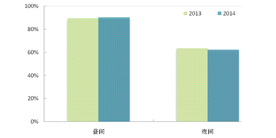 2014年上半年全省城市功能區噪聲晝間監測點次達標率為89.9%,與上年同期相比,上升了0.8個百分點。韶關、珠海、惠州、梅州、河源、陽江、潮州和揭陽等8市功能區噪聲晝間監測點次達標率最高,為100%;云浮和廣州兩市功能區噪聲晝間監測點次達標率較低,分別為75%和63.6%。