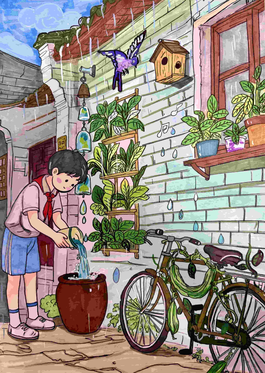 創作感想:雨落北京路騎樓,青磚墻淌水,窗陽臺綠化,居民澆花、自行車纏綠蔓,舊物活用,低碳日常暈織嶺南街巷的環保詩意。