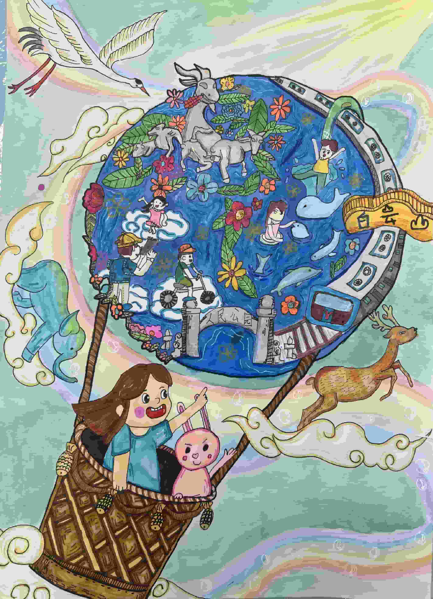 創作感想:畫面孩子坐著升氣球開啟綠色環球之旅,如亞馬遜雨林、非洲草原等,展現地球生物的多樣性與活力。畫面主體為手捧嫩芽的孩童,象征希望與守護,倡導全球協作、低碳出行,共同守護我們唯一的綠色家園。