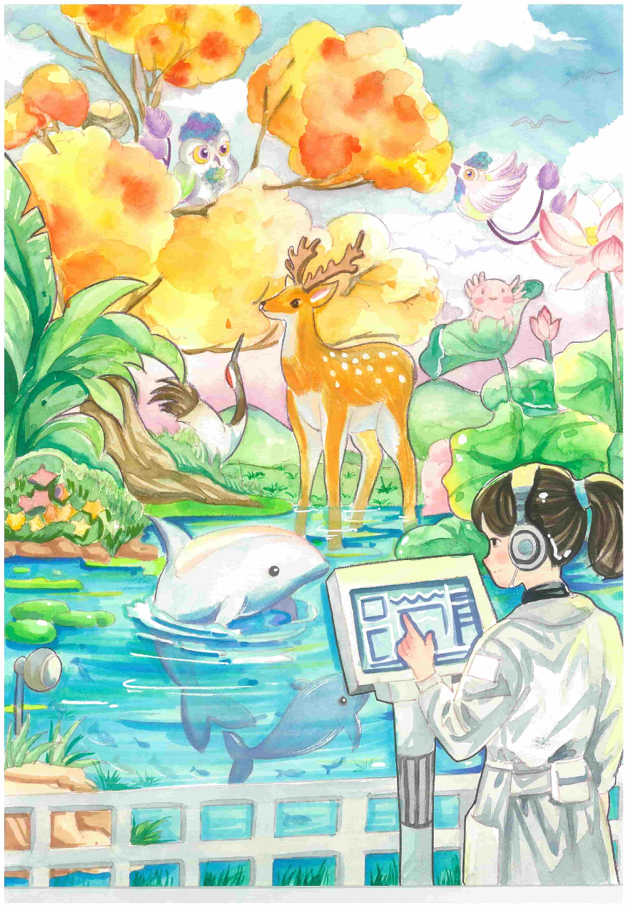 創作感想:作品以保育員聚焦東山湖中的透明生態培育艙,觀察各類瀕危物種保育過程為主,全息投影中顯示種群基因圖譜。背景為珠江濕地,佩戴追蹤器的放歸個體與仿生無人機巡護系統協同互動,科技賦能而構建的“越秀區公園城市”成為瀕危物種的"生命方舟"。