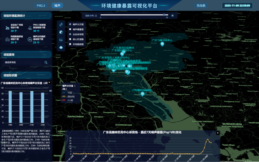 廣東省廣州生態環境監測中心站(簡稱“廣州監測站”)聯合中山大學地理科學與規劃學院,開展了一場關于賽事期間人群健康與PM2.5、噪聲、熱指數相關性的深度研究。