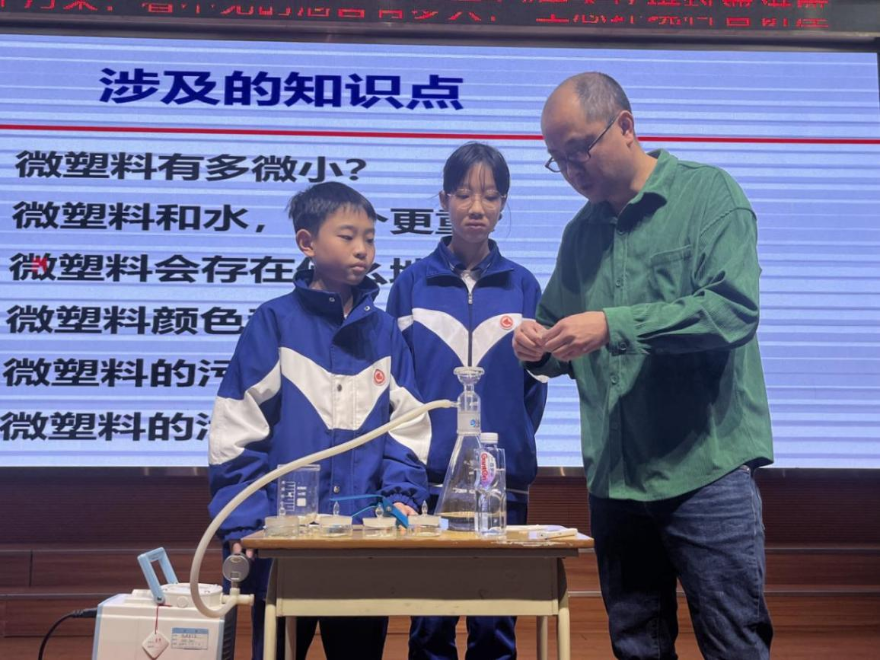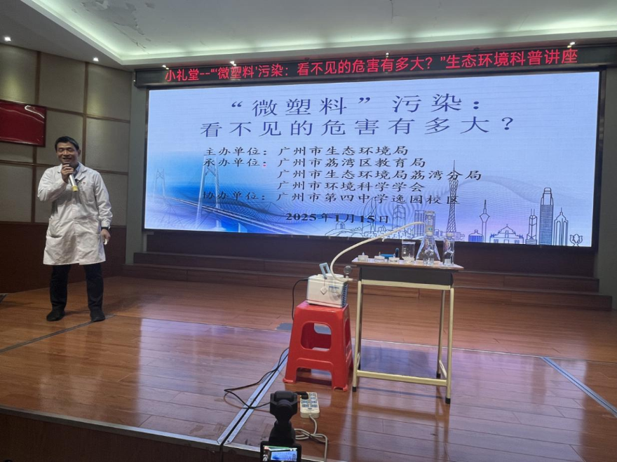 在廣州市第四中學逸園校區舉辦的生態環境課堂,由廣州市生態環境局主辦,邀請了廣東省廣州生態環境監測中心站高級工程師周樹杰向初一級的學生們詳細介紹了微塑料,深入剖析微塑料污染危害以及所帶來的負面影響,并講述和分析了珠江廣州段微塑料污染現狀,同時分享了當前正在研究的治理策略和技術進展,呼吁青少年日常積極踐行綠色生活,倡導購物使用環保購物袋,減少使用一次性塑料袋,減少白色污染,用實際行動保護生態環境。