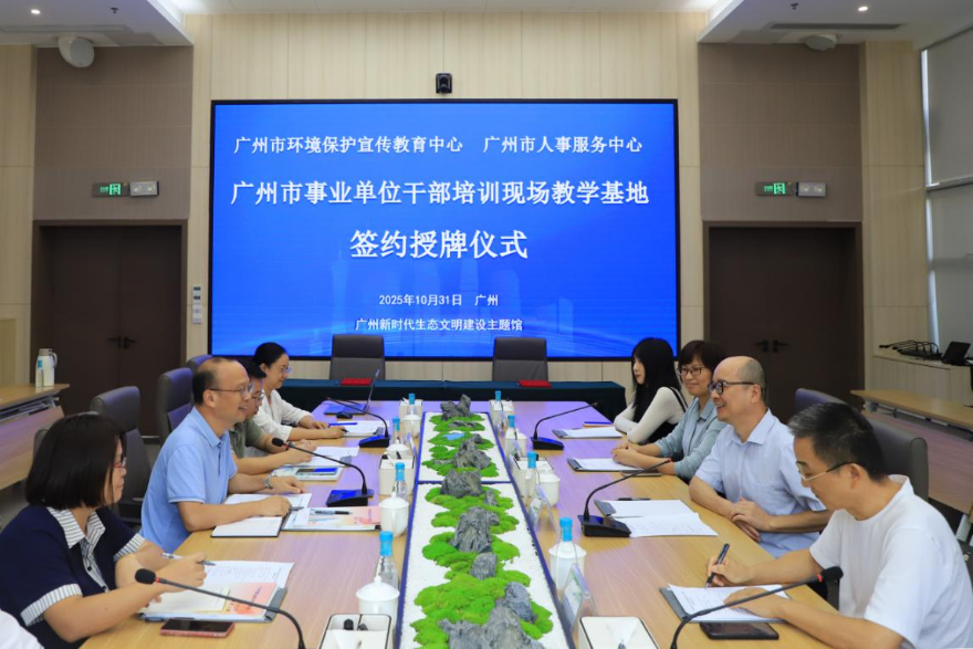 10月31日,廣州市環境保護宣傳教育中心與廣州市人事服務中心在廣州水博苑舉行座談簽約、授牌儀式,正式將“廣州新時代生態文明建設主題館”(以下簡稱“主題館”)納入“廣州市事業單位干部培訓現場教學基地”。此舉標志著廣州在深化生態文明宣傳教育、推動干部能力建設與全民生態環保行動融合方面再上新臺階。