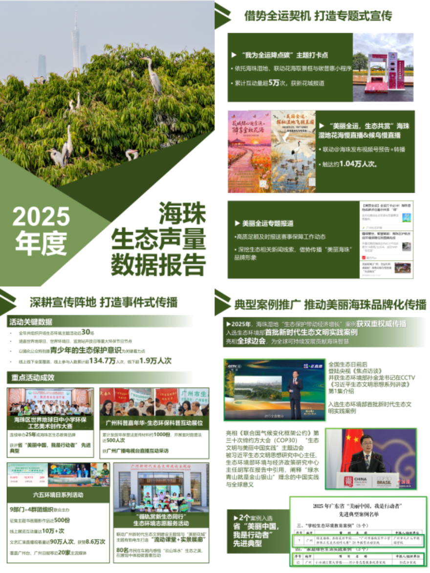 為系統梳理2025年度生態文明宣傳成效,海珠區重磅發布《2025年度海珠生態聲量數據報告》,以數據串聯起這一年生態文明宣傳的“高光瞬間”。