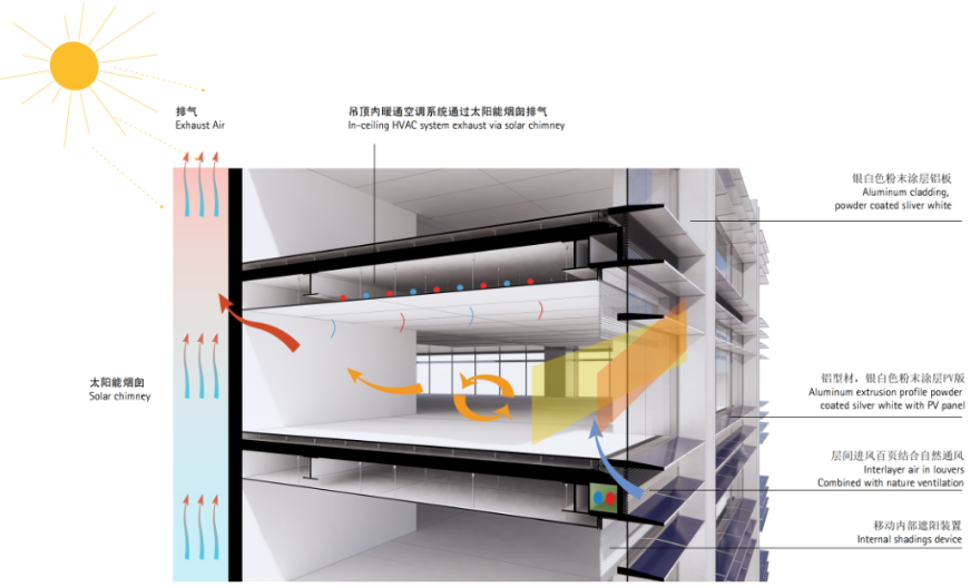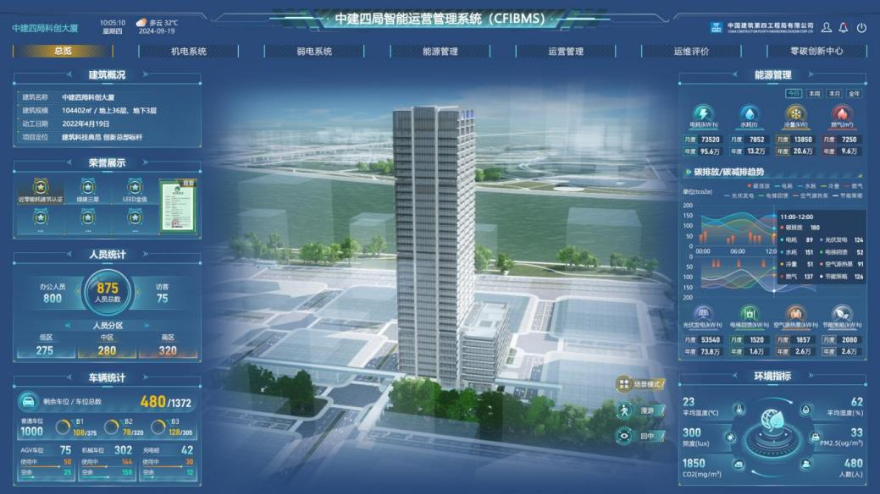 在建設(shè)伊始,天河區(qū)就積極鼓勵(lì)中建四局科創(chuàng)大廈從建筑本體節(jié)能、主動(dòng)能效提升、可再生能源充分利用、運(yùn)行調(diào)節(jié)與管理、碳清除和碳抵消等5個(gè)維度,全面提高建筑節(jié)能降碳水平。在建筑本體節(jié)能方面,設(shè)置太陽能煙囪、冷巷,最大限度地利用自然通風(fēng),同時(shí)因地制宜規(guī)劃布局,利用高性能圍護(hù)結(jié)構(gòu)、自然采光、遮陽等被動(dòng)式技術(shù),營(yíng)造健康室內(nèi)環(huán)境,最大程度降低建筑用能需求。在主動(dòng)能效提升方面,采用高效制冷機(jī)房、新風(fēng)全熱回收、高效智能照明系統(tǒng)、高效電梯等措施,最大程度降低能源消耗。在可再生能源方面,在塔樓屋頂、幕墻橫向裝飾翼以及裙樓屋頂創(chuàng)新性應(yīng)用建筑光伏發(fā)電系統(tǒng),年發(fā)電量約65萬度,年減碳量可達(dá)350噸。在運(yùn)行調(diào)節(jié)與管理方面,搭建智慧物聯(lián)網(wǎng)系統(tǒng),實(shí)現(xiàn)智慧管理平臺(tái)可視化、能源系統(tǒng)AI優(yōu)化控制,高效開展能源管理數(shù)據(jù)統(tǒng)計(jì)分析和預(yù)測(cè)工作。在碳清除和碳抵消方面,采用多種形式景觀,充分利用綠化碳匯碳清除效果,運(yùn)行階段采用綠色電力證書交易的形式,抵消大樓運(yùn)行階段剩余碳排放,交易期間實(shí)現(xiàn)樓宇運(yùn)行階段凈零碳排放。