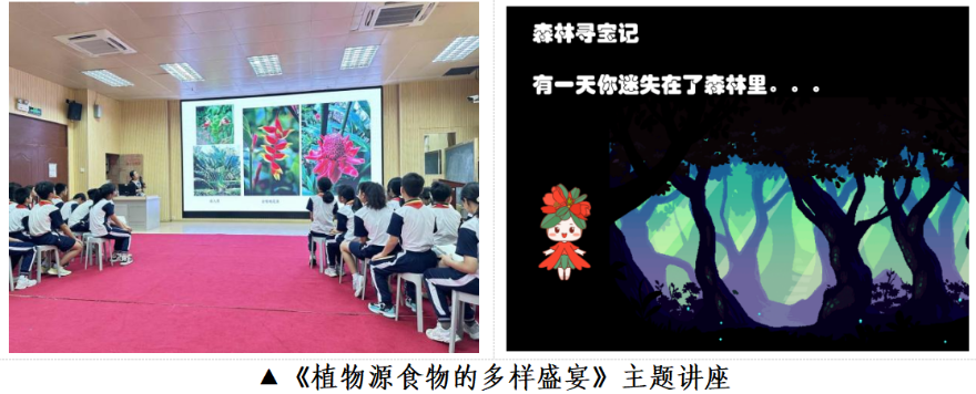 在森林中,紫瑩瑩的桃金娘猶如綴滿枝頭的紫紅寶石;作為果樹中的活化石,拐果棗像捉迷藏的俏皮精靈在枝葉間閃爍;猴面包樹挺著大肚子,里面盛滿歲月沉淀的淀粉寶藏;被稱為“山菜之王”的蕨,在山風里跳起優雅的圓舞曲;更有竹芋、香莢蘭、神秘果等植物藏著顛覆味覺的魔法……華南國家植物園文化形象IP“萌寶”化身導游,帶領同學們探索森林中植物源食物的奧秘。在《植物源食物的多樣盛宴》科普講座上,主講老師通過講述植物與食物之間的聯系以及大食物觀下的“美味星球”,并用生動的案例引導同學們思考如何實現食物資源的多元開發。