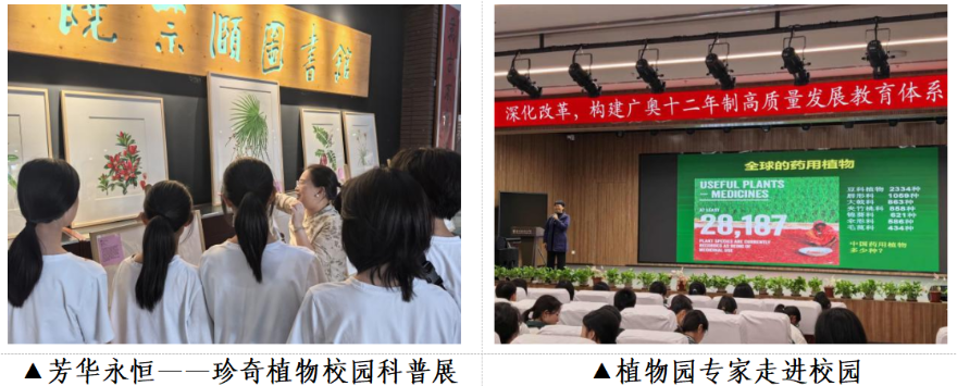 《芳華永恒——珍奇植物校園科普展》在廣東省天省實驗學校、廣州市天河區匯景實驗學校、廣州奧林匹克中學3所學校中開展,依托植物科學畫和活植物/植物標本,以珍稀瀕危、奇異美麗的植物為題材,以科學畫作為載體,向學生講述畫作背后鮮為人知的珍稀瀕危植物保護和植物科學研究的故事。同時,配套開展《追本溯源》《藥食同源話枸杞》《瓊英逸韻 芳華永恒》等講座,通過植物園專家走進校園、將課堂移至植物園、珍稀植物來到校園等多種形式,讓同學們直觀感受生物多樣性保護的重要性。