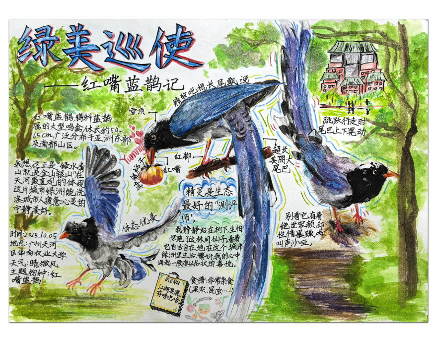 廣州市天河區(qū)棠德南小學(xué)王好同學(xué)自然筆記《綠美巡使——紅嘴藍鵲記》——這場綠美之旅記錄了熱愛觀鳥小作者與紅嘴藍鵲美麗邂逅。這些林間精靈存在,正是天河區(qū)持續(xù)推進美麗天河建設(shè)最佳印證。愿這份見證能喚起更多人對自然熱愛、對生態(tài)保護,共同守護我們賴以生存綠色家園。