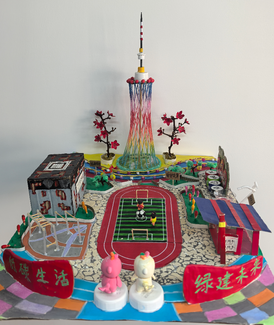 廣州市天河區(qū)棠德南小學(xué)歐錦希《指尖天河,綠色全運》作品融合廣州地標(biāo)與十五運會主題,用麻繩、廢紙皮等環(huán)保材料,呈現(xiàn)廣東省博物館、廣州塔、木棉樹等城市元素,結(jié)合垃圾分類、綠植等環(huán)保與生態(tài)理念,以運動場、吉祥物烘托全運氛圍,將體育活力、天河風(fēng)貌與環(huán)保意識融為一體。