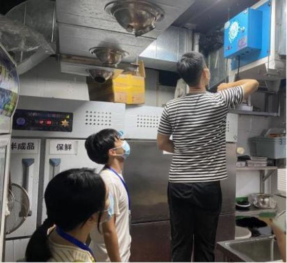 如平常一樣,他們聯合街道專職環保員在餐飲店,重點檢查餐飲選址是否得當及油煙凈化設施是否正常運行、是否定期清洗維護、是否建立運維臺賬等,督促企業保證設施正常運行、達標排放。