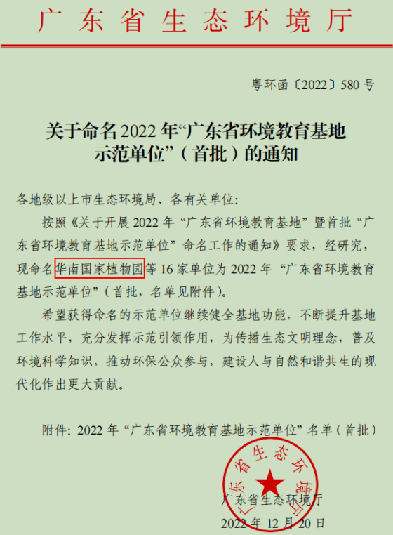 日前,廣東省生態環境廳印發通知,華南國家植物園等16家單位被命名為2022年“廣東省環境教育基地示范單位”(首批)。