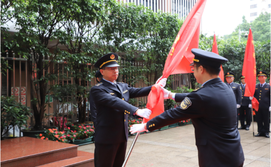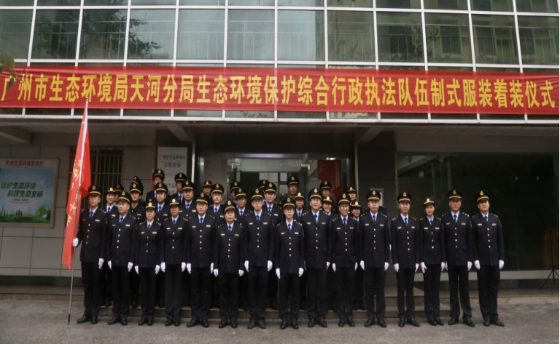 2023年3月30日下午,廣州市生態環境局舉行廣州市生態環境保護綜合行政執法隊伍制式服裝著裝儀式,局黨組書記、局長楊柳同志為局執法支隊和11個分局大隊授隊旗。天河分局接受授旗后,隨即在分局大樓前舉行生態環境保護綜合行政執法隊伍制式服裝著裝儀式。