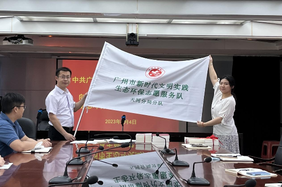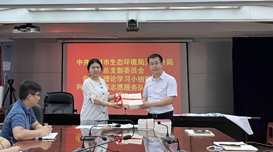 活動現(xiàn)場,分局黨總支負(fù)責(zé)人向青年理論學(xué)習(xí)小組贈送學(xué)習(xí)書籍,并向生態(tài)環(huán)保志愿服務(wù)隊(duì)天河分局分隊(duì)授旗。沉甸甸的學(xué)習(xí)書籍、飄揚(yáng)的志愿旗幟,是分局對青年同志的殷殷期盼,引領(lǐng)廣大青年永遠(yuǎn)跟黨走、奮進(jìn)新征程、建功新時代。