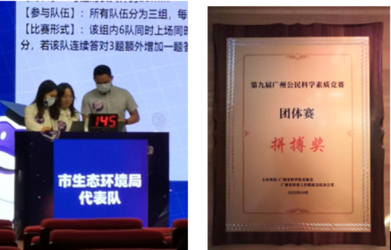 10月19日下午,廣州市科普工作聯(lián)席會(huì)議辦公室在廣州青少年科技館舉辦第九屆廣州公民科學(xué)素質(zhì)競(jìng)賽預(yù)賽,市生態(tài)環(huán)境局代表張宏波、梁嘉怡、張昕、黃敬民、王關(guān)波參加了預(yù)賽,并獲得團(tuán)體賽“拼搏獎(jiǎng)”。