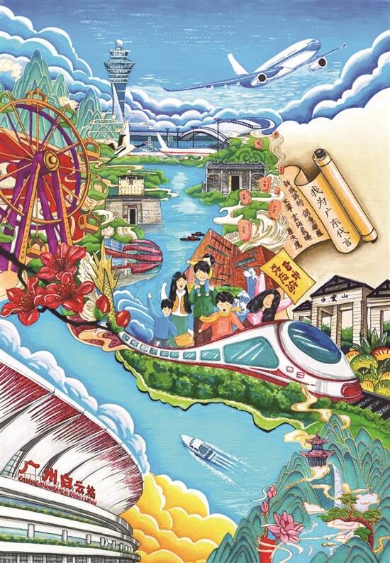 手繪海報一等獎作品《白云新繪·十景畫卷》,以明快絢麗的色彩為底,巧妙融合高鐵、飛機等現代交通地標,串聯起摩天輪、古建筑、山水盛景,木棉盛放、白鶴翱翔于河畔,還有一家人乘高鐵時的歡樂互動,搭配“我為廣東代言”的卷軸與“白云歡迎您”的標牌,展現出美麗廣州的獨特魅力。