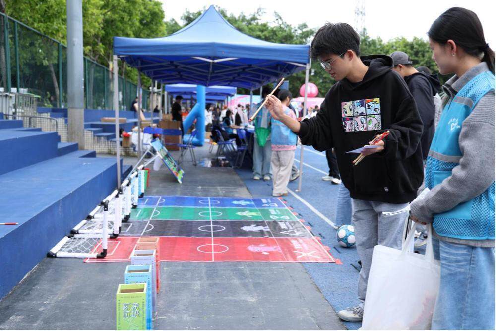 宣傳點位設置了 “分類投沙包”“乒乓速分臺”“綠茵分投戰”“投分類壺”等一系列寓教于樂的互動游戲,吸引眾多學生積極參與。