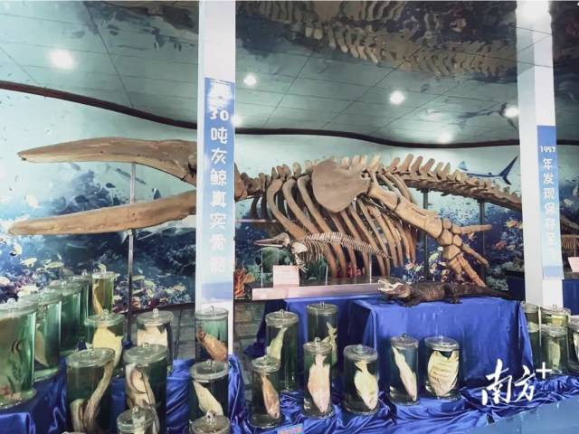 步入場館,透明地板下的海螺群落緩緩鋪展,直觀呈現底棲生物的生存環境。干標本展區內,鱘魚、姥鯊、翻車鲀等水生生物標本錯落陳列,訴說著不同物種在生態系統中的獨特作用。館內的“鎮館之寶”——1953年保存至今的30噸灰鯨骨骼,更以震撼的視覺效果,讓市民感受海洋生態系統的脆弱與珍貴。