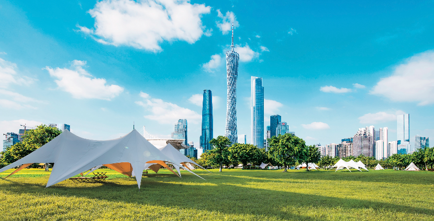 廣州城市地標建筑和公園露營草地上的帳篷。 視覺中國/供圖