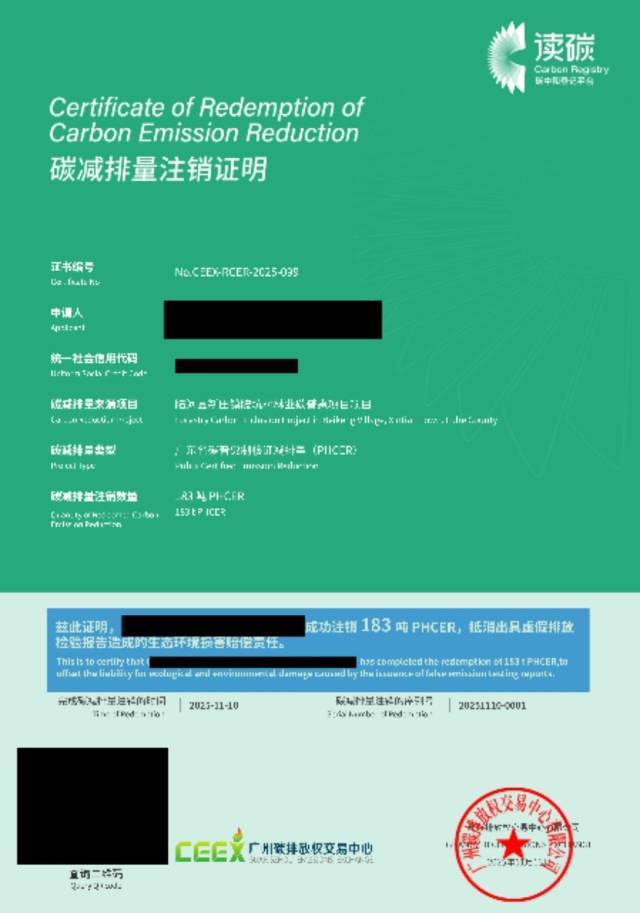 2天內履行賠償修復:企業按照賠償金額認購經核證的廣東省碳普惠減排量183噸完成替代修復。