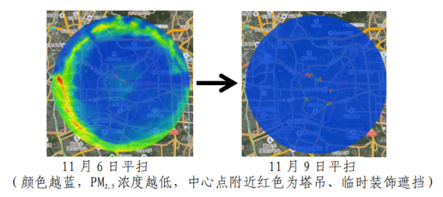 在11月7日—9日保障期間,通過每小時發布激光雷達平掃結果,精準發現4處顆粒物熱點區域,實現即掃、即查、即改,以工地、道路周邊PM2.5小時監測濃度作為檢驗揚塵治理成效的依據,每小時督導整改反饋情況,努力做到“異常點位只出現一小時”,讓治理決策有數據支撐、有方向可循、有手段可治。