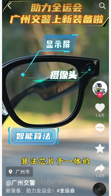 抖音號“廣州交警”分別于11月5日、7日發布視頻《全運會出行,溫馨提示!》《新裝備,助力全運會》。一方面,以圖示、視頻形式介紹交通管理措施。系列視頻通過動畫圖示、情景式執法介紹廣州市機動車臨時交通管理措施、一線警力配發AI眼鏡等保障十五運服務措施,提升政策易讀性、可讀性。另一方面,系列視頻獲網民積極轉發擴散,互動數據亮眼。廣州交警11月5日發布的視頻累計收獲1.6萬轉發量、1.5萬點贊量,7日發布的視頻累計收獲1.6萬點贊量、1.4萬轉發量,均位居本月廣州市政務抖音視頻單條視頻點贊量、轉發量前10位,評論量則分別位居第一、第三位。