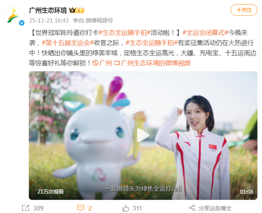 微博號“廣州生態環境”分別于11月9日、21日發布帖文“一鍵轉發全運綠色承諾,贏取環保大禮包!”“世界冠軍陳玲邀你打卡生態全運隨手拍活動啦!”,一是在十五運開閉幕式節點,發布生態全運系列抽獎活動信息。@廣州生態環境 在11月9日、21日分別發博邀請網民轉發參與“全運綠色承諾”“生態全運隨手拍”等系列抽獎活動,將生態與賽事融合,激勵市民以實際行動踐行綠色觀賽、低碳出行、節能助威等承諾。二是網民參與熱情高漲,系列活動反響熱烈。@廣州生態環境 11月19日、21日發布的視頻“生態全運隨手拍活動延期! 大獎依舊給力”“世界冠軍陳玲邀你打卡生態全運隨手拍活動啦!”分別有10.5萬次、21萬次觀看,帶動話題#生態全運隨手拍#閱讀量達127.1萬,討論量、互動量累計超1.1萬。三是系列活動帶動賬號多維度影響力提升,廣州生態環境綜合影響力較上月上升13個名次,位居本月廣州市政務微博影響力第3名,傳播力、互動力、引導力均位居第5名。
