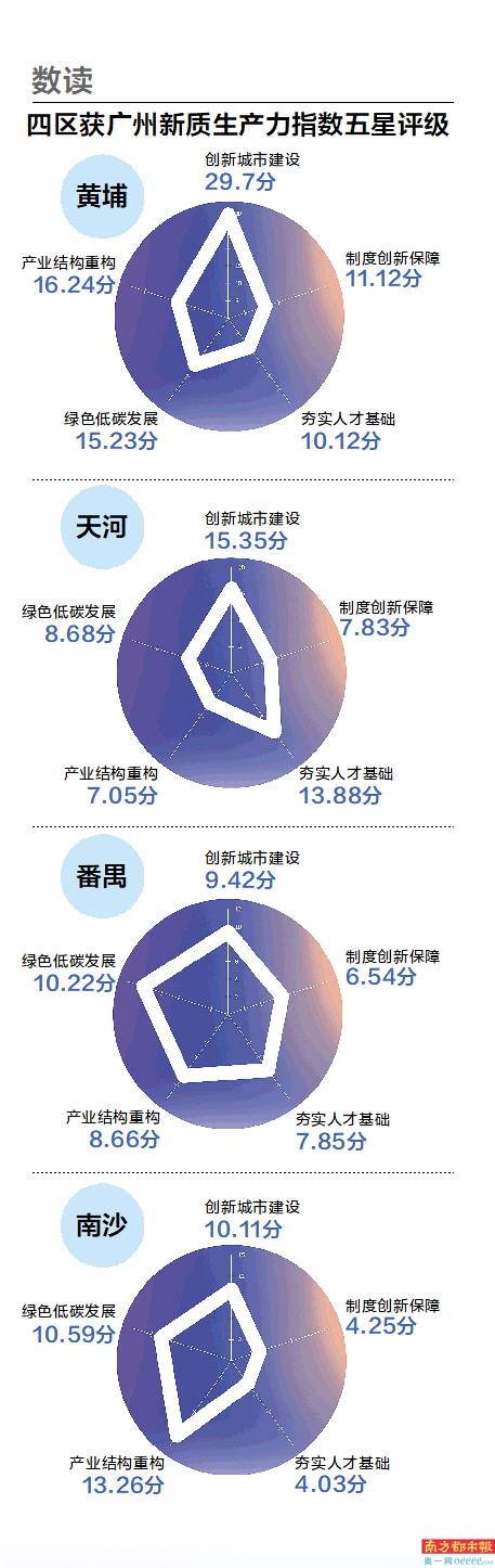 2025年,南都高質量發展研究院升級推出廣州新質生產力指數報告2.0版,圍繞加快城市發展方式轉型,推動城市高質量發展,設置五大維度近40個指標,對廣州11個行政區進行評價,通過指數化計算后形成一份榜單。結果顯示,黃埔、天河、番禺、南沙獲最高五星評級。