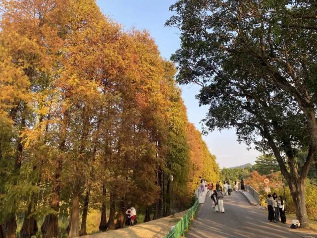 作為路線首站,華南國家植物園在元旦期間迎來一年一度的“紅葉季”。園區內落羽杉林色彩斑斕,從嫩綠漸變為橙紅、深紅,落羽杉倒映在水中,仿佛流動的油畫,吸引眾多攝影愛好者和游客前來打卡。