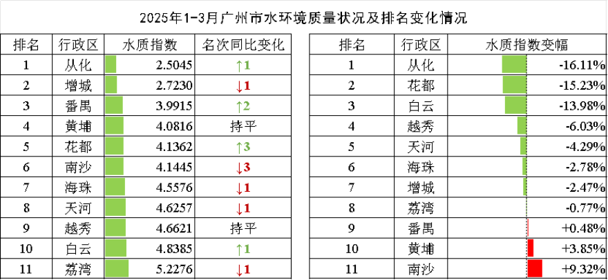 2025年1-3月,按照水質指數由低到高排名,各區地表水環境水質指數排名前三名為從化區、增城區、番禺區,后三名(從倒數第1名至倒數第3名)為荔灣區、白云區、越秀區。8個區水環境質量同比有所改善,其中從化區、花都區、白云區水質改善幅度均超過10%。