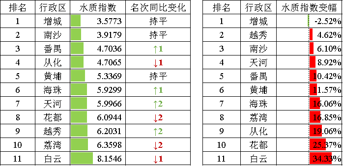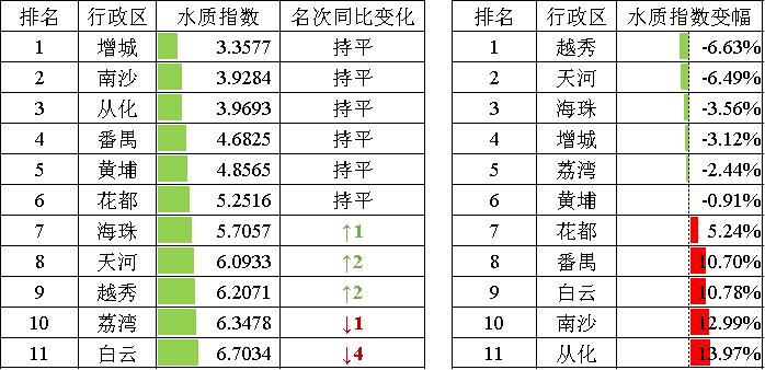 2021年5月,各區(qū)地表水環(huán)境水質(zhì)指數(shù)排名前三位為增城、南沙、番禺,后三位為白云、荔灣、越秀。其中增城區(qū)水環(huán)境質(zhì)量同比有所改善。