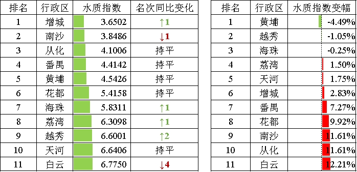 2021年10月,各區(qū)地表水環(huán)境水質(zhì)指數(shù)排名前三位為從化、南沙、增城,后三位為天河、越秀、白云。