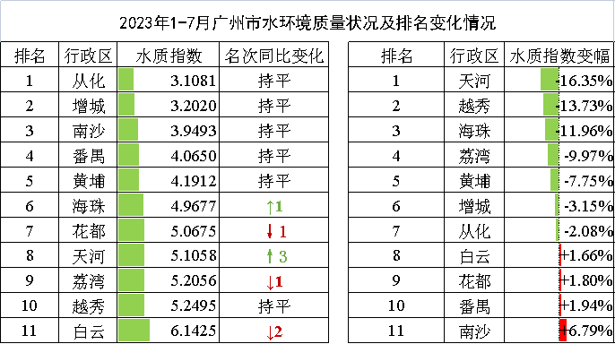 2023年1-7月,各區地表水環境水質指數排名前三位為從化區、增城區、南沙區,后三位為白云區、越秀區、荔灣區。7個區水環境質量同比有所改善,其中天河、越秀、海珠等3個區水質改善幅度超過10%。