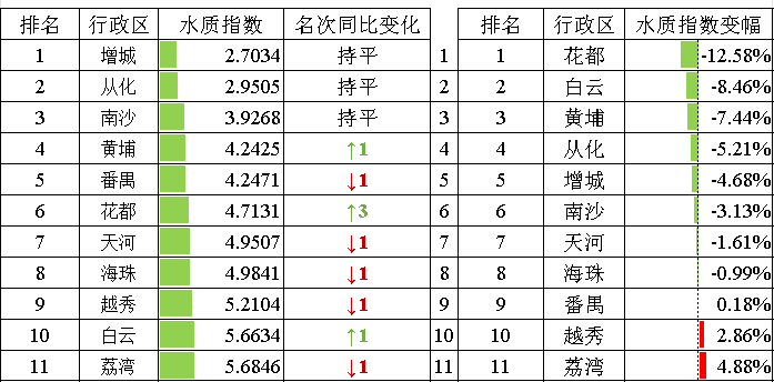 注:1.水質指數變幅為水質指數同比,小于0表示改善,大于0表示變差。