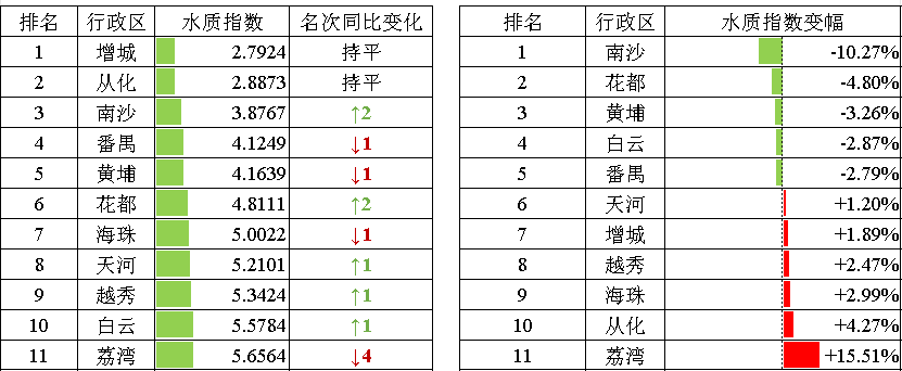 注:1.水質指數變幅為水質指數同比,小于0表示改善,大于0表示變差。