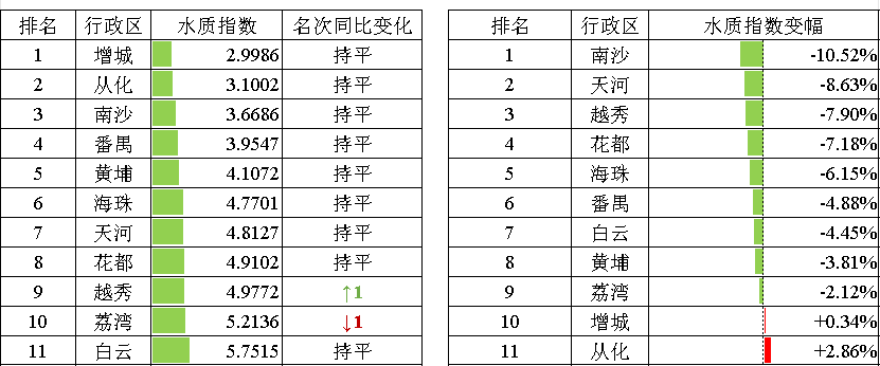 注:1.水質指數變幅為水質指數同比,小于0表示改善,大于0表示變差。