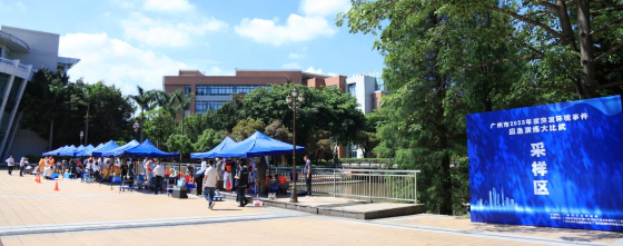 7月13日下午3點(diǎn)20分,烈日當(dāng)空,伴隨“嗡……”的轟鳴聲,無人機(jī)騰空而起,2023年度廣州市突發(fā)環(huán)境事件應(yīng)急演練大比武拉開了序幕。廣州市生態(tài)環(huán)境局各分局挑選應(yīng)急管理、應(yīng)急監(jiān)測(cè)方面的骨干力量組建了11個(gè)參賽隊(duì)伍,齊聚中山大學(xué)廣州校區(qū)東校園內(nèi),開展本年度的比武較量。