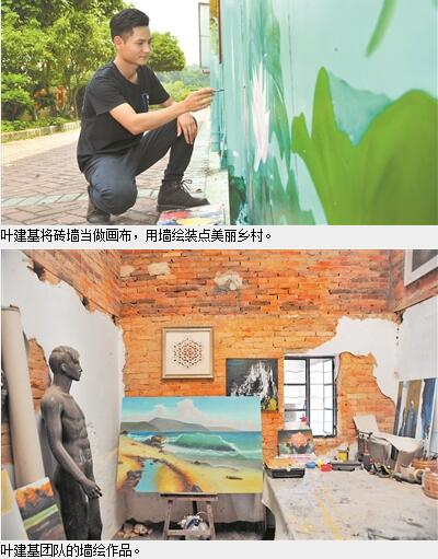 今年24歲的葉建基是大埔圍村人。兩年前,從廣州大學(xué)美術(shù)與設(shè)計(jì)學(xué)院工藝美術(shù)專業(yè)畢業(yè)的他,決定回到不足千人的大埔圍村創(chuàng)辦藝術(shù)空間。兩年間,他將村里的墻體當(dāng)畫布,既美化了鄉(xiāng)村,更成就了自己的事業(yè),還帶動(dòng)了鄉(xiāng)鄰就業(yè)。如今,他的墻繪團(tuán)隊(duì)年收入逾70萬元。今年4月,他的工作室還被評(píng)為增城區(qū)農(nóng)村青年創(chuàng)業(yè)示范點(diǎn)。